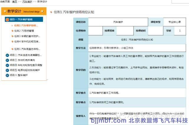 汽車維護(hù)教學(xué)設(shè)計(jì)由項(xiàng)目與任務(wù)組成,包含6個(gè)大項(xiàng)目、31個(gè)任務(wù)。其中任務(wù)里有教學(xué)方法、教學(xué)目的、教學(xué)重點(diǎn)、教學(xué)難點(diǎn)、情景導(dǎo)入、工具資料、教學(xué)過(guò)程、教學(xué)內(nèi)容、自主學(xué)習(xí)等一些設(shè)計(jì)。