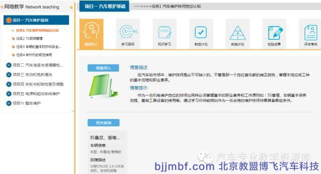 汽車維護(hù)的網(wǎng)絡(luò)教學(xué)中,由項(xiàng)目與任務(wù)組成,包含6個(gè)大項(xiàng)目、31個(gè)任務(wù)。每個(gè)任務(wù)由七步組成,情景導(dǎo)入、學(xué)習(xí)目標(biāo)、知識(shí)學(xué)習(xí)、制定計(jì)劃、實(shí)施計(jì)劃、檢驗(yàn)成果、評(píng)估考試。每個(gè)任務(wù)中都有相關(guān)案例可以觀看。