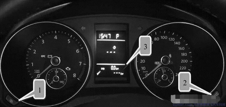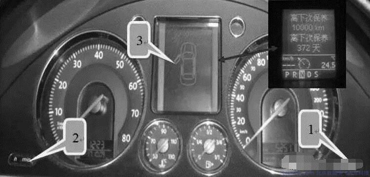 (4)檢查方法是打開點火開關(guān),按下1按鈕并保持住3s,待儀表多功能顯示器3中顯示出距離下次保養(yǎng)的間隔里程和間隔時間。
