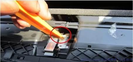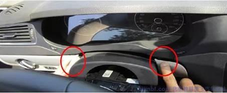 2.下圖圓圈標(biāo)注位置有兩個(gè)卡子,用適當(dāng)?shù)牧ο蛳玛x表下護(hù)板,使出風(fēng)口的卡子漏出來(lái)。