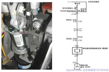 ?該車的制動(dòng)/換擋互鎖裝置,是由BCM控制的一個(gè)電磁閥來實(shí)現(xiàn)的。KEY ON、P檔,BCM為該電磁閥通電,鎖定換擋桿。當(dāng)制動(dòng)踏板踩下后,電磁閥斷電,在電磁閥內(nèi)回位彈簧的作用下,閥銷(芯)回位,釋放鎖定裝置,檔桿可以從P檔位置移出。