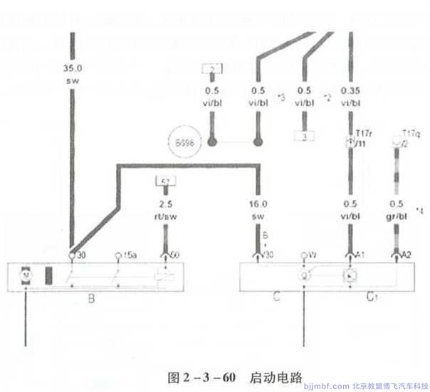 分析可能的故障原因:①啟動(dòng)機(jī)上的端子50導(dǎo)線或插頭,電路圖如圖2-3-60 所示。②自交流發(fā)電機(jī)至啟動(dòng)機(jī)的正極導(dǎo)線故障。