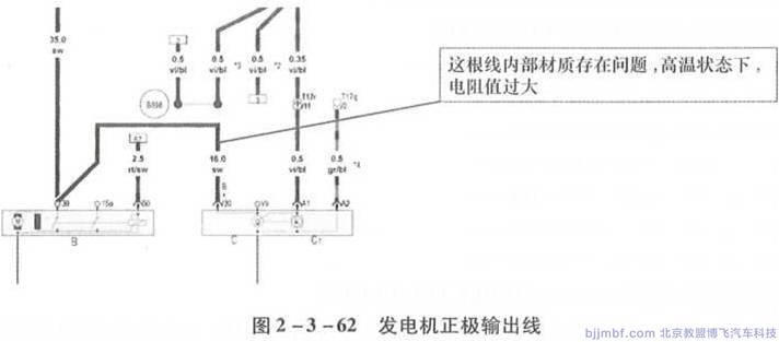 ?發(fā)電機(jī)正極輸出線因自身材料原因?qū)е赂邷貭顟B(tài)下電阻升高,如圖2-3 -62所示。發(fā)電機(jī)發(fā)出電壓無(wú)法正常輸送至啟動(dòng)機(jī)并供給蓄電池充電,網(wǎng)關(guān)監(jiān)控到蓄電池電壓過(guò)低,但通過(guò)讀取發(fā)電機(jī)DF激勵(lì)信號(hào)分析發(fā)電機(jī)巳經(jīng)正常工作,故VAS5052診斷系統(tǒng)提示故障原因在于“自交流發(fā)電機(jī)至啟動(dòng)機(jī)的正極導(dǎo)線”,判斷導(dǎo)線問(wèn)題阻礙了電流的正 常導(dǎo)通,進(jìn)而車(chē)輛組合儀表出現(xiàn)報(bào)警,耗盡蓄電池電量后,最終車(chē)輛發(fā)生拋錨。