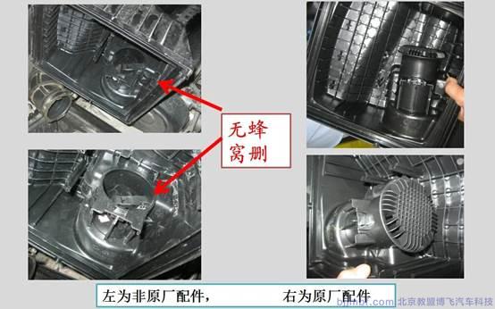 ? ? ? 對比正常的空氣濾清器殼體,該車的空氣濾清器殼體上,安裝MAF的進(jìn)氣管管口,沒有蜂窩刪,這個蜂窩刪,并不是過濾空氣用的,而是調(diào)整氣流,使進(jìn)氣氣流連續(xù)的按照一定的方向流過MAF,可以說是與MAF采樣相配合。如果沒有這個蜂窩刪,氣流會由于進(jìn)氣脈動以及進(jìn)氣管的阻力,出現(xiàn)不穩(wěn)地的紊流,通過MAF,造成MAF檢測的空氣流量大于實(shí)際進(jìn)入氣缸的氣流量。
