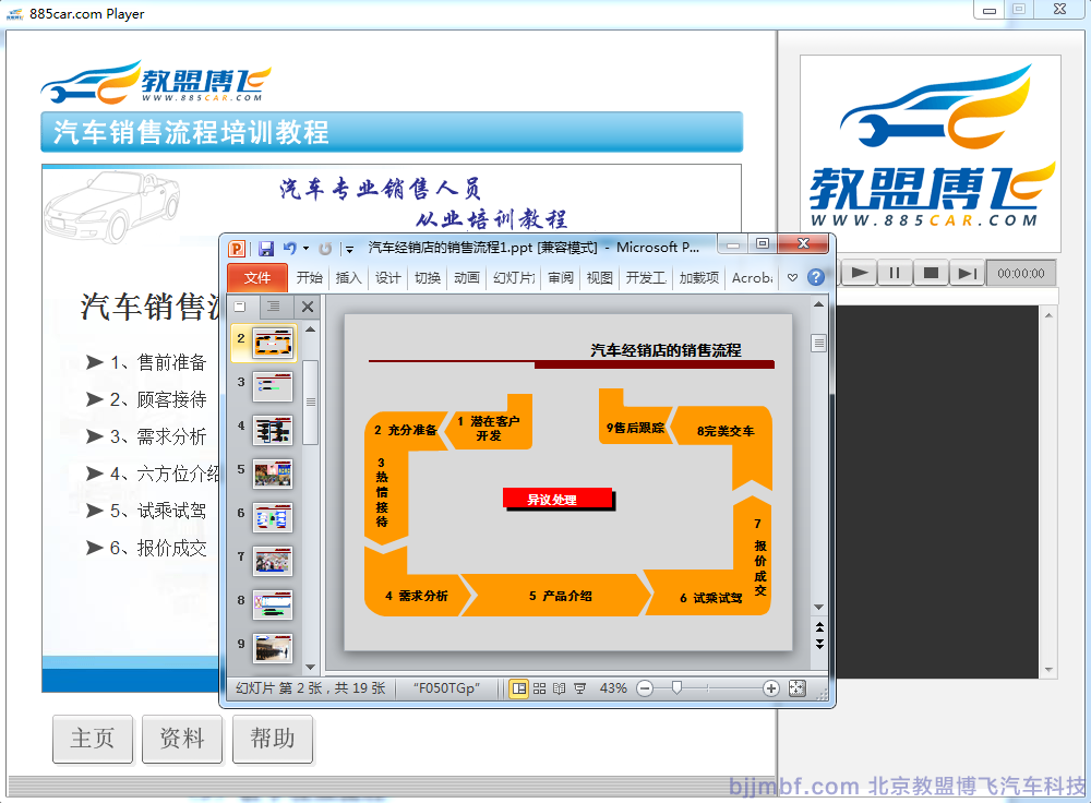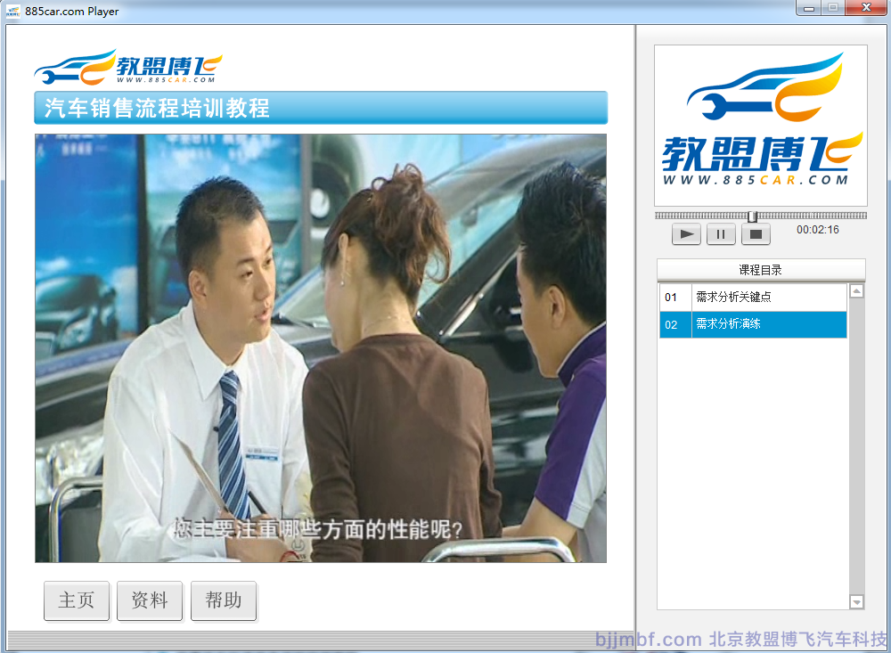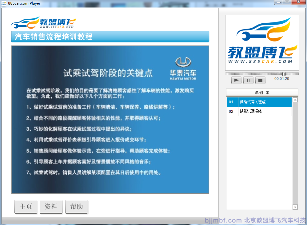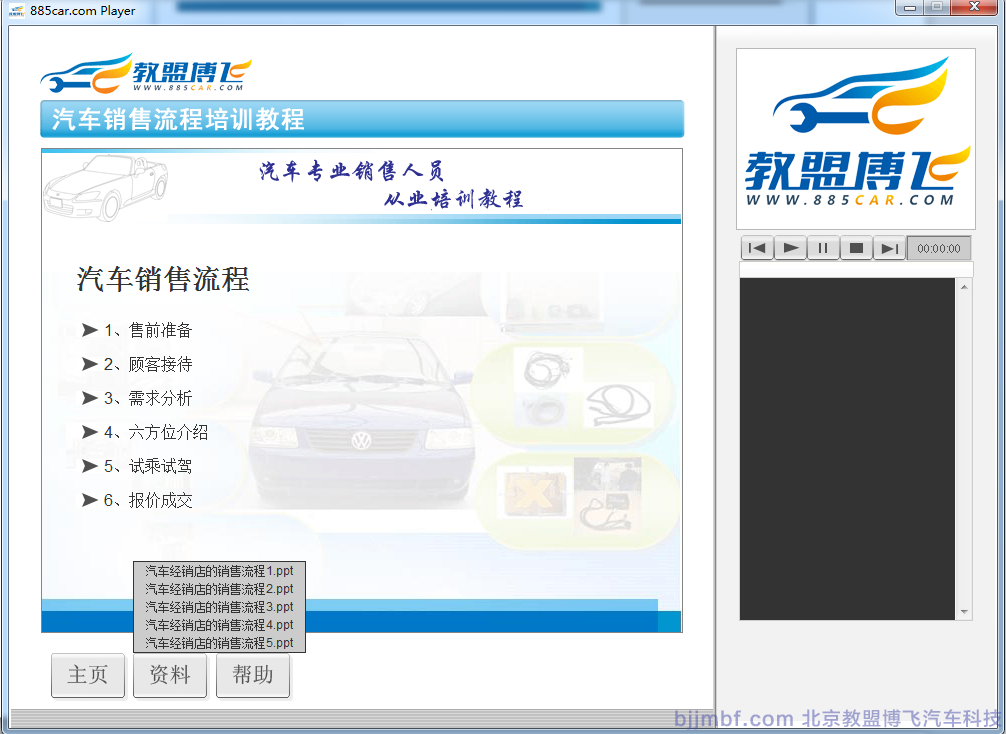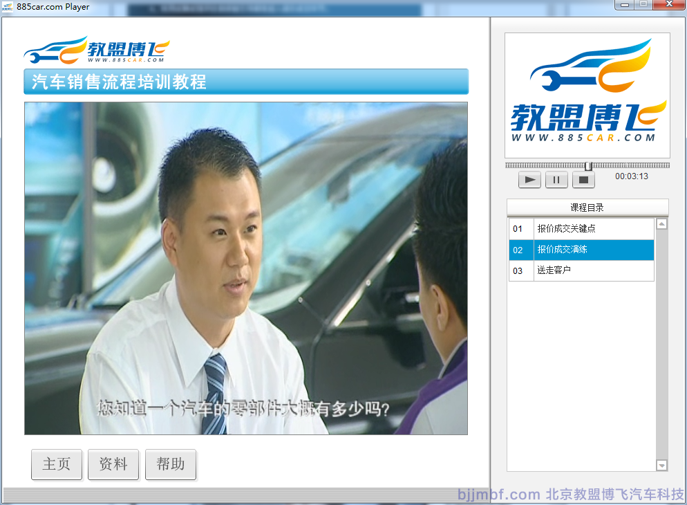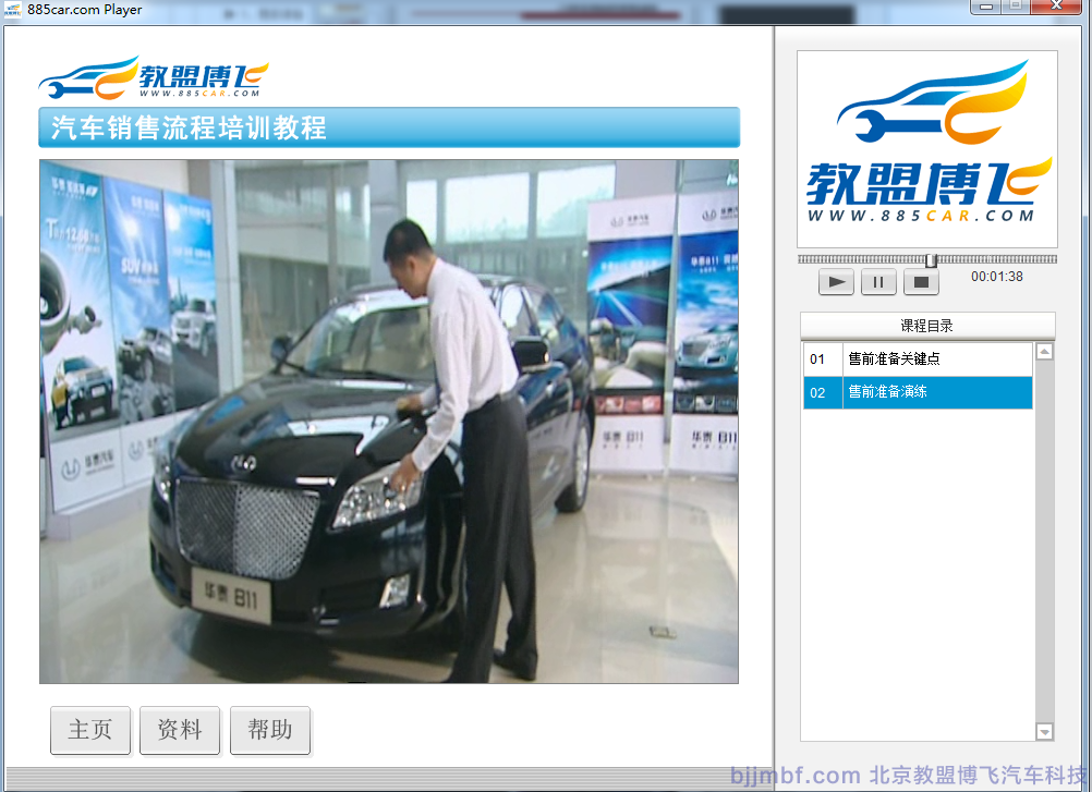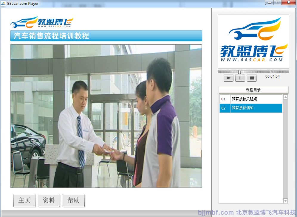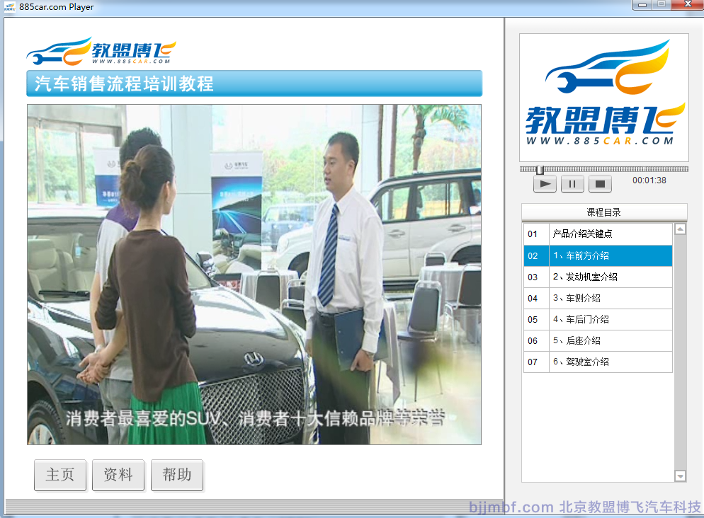 《汽車銷售流程視頻教程》全景視頻教學(xué)系統(tǒng)結(jié)合廠家標(biāo)準(zhǔn)銷售規(guī)范流程,標(biāo)準(zhǔn)化操作完成售前準(zhǔn)備、顧客接待、需求分析、六方位介紹、試乘試駕、報(bào)價(jià)成交等一系列完整售后服務(wù)流程;教學(xué)系統(tǒng)運(yùn)用平面、視頻、多維動(dòng)畫技術(shù)形成一套集講授、實(shí)景演示、重點(diǎn)回顧、標(biāo)準(zhǔn)銷售商務(wù)課件等立體視頻教學(xué)系統(tǒng);完整詳細(xì)的汽車服務(wù)過程中標(biāo)準(zhǔn)流程、標(biāo)準(zhǔn)銷售話術(shù)、顧客心理需求、異議處理、各種細(xì)節(jié)及服務(wù)技巧;彌補(bǔ)傳統(tǒng)視頻畫面單一,重點(diǎn)不突出,標(biāo)準(zhǔn)規(guī)范不明顯等缺點(diǎn);立體視頻教學(xué)系統(tǒng)同時(shí)具備一定的自動(dòng)考核、教學(xué)環(huán)境識(shí)別等功能,從而提高學(xué)習(xí)和訓(xùn)練效率。